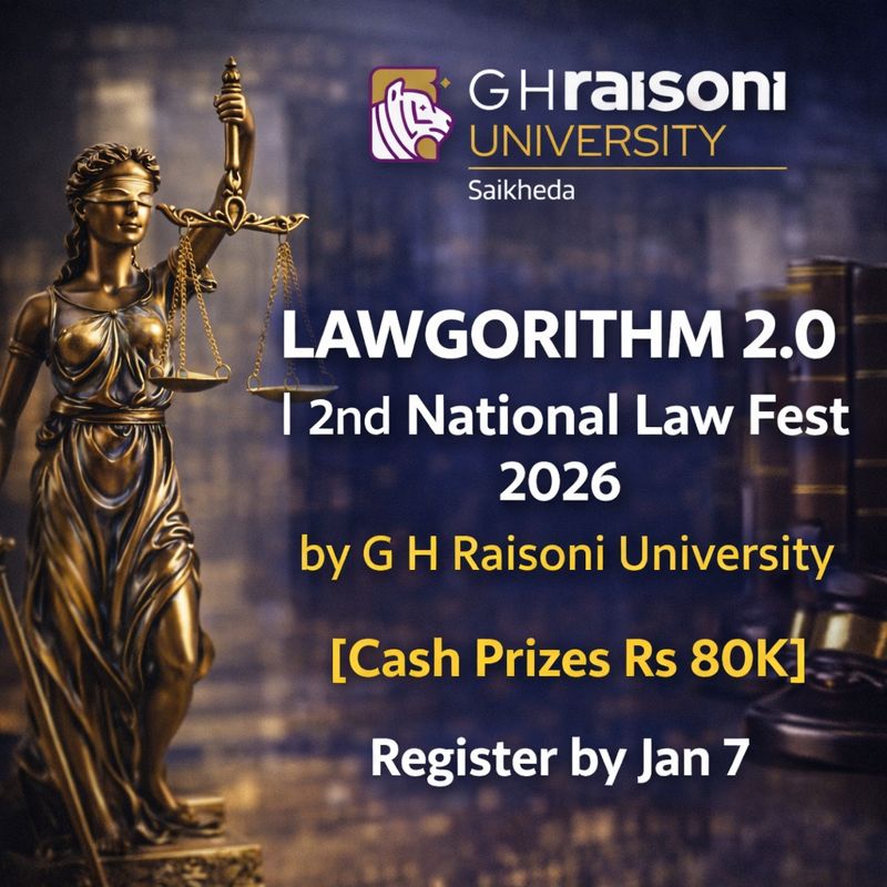 LAWGORITHM 2.0 is the 2nd National Law Fest 2026 organised by G H Raisoni University, School of Law. Participate in exciting legal competitions and win cash prizes worth ₹80,000. Register by January 7.