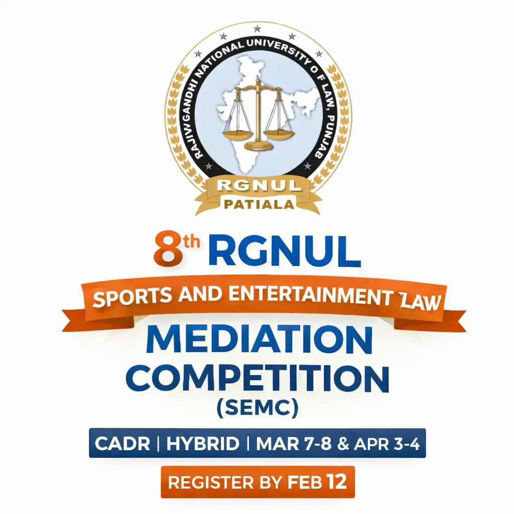 We are delighted to announce the Eighth Edition of the RGNUL Sports & Entertainment Law Mediation Competition 2026, organised by the Centre for Alternative Dispute Resolution, Rajiv Gandhi National University of Law, Punjab. The competition is scheduled to take place from 7th to 8th March, 2026, in online mode and 3rd to 4th April, 2026, in offline mode.