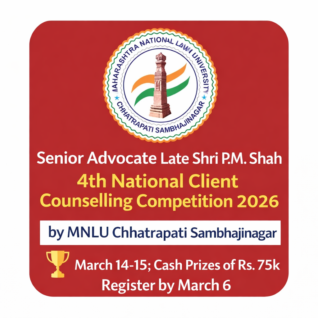 MNLU Chhatrapati Sambhajinagar is organizing the Senior Advocate Late Shri P.M. Shah National Client Counselling Competition, 2026. The competition pays tribute to Late Shri P.M. Shah, a designated Senior Advocate of the Bombay High Court and former Vice-Chairman of the Bar Council of Maharashtra & Goa, known for his ethics and professional acumen.