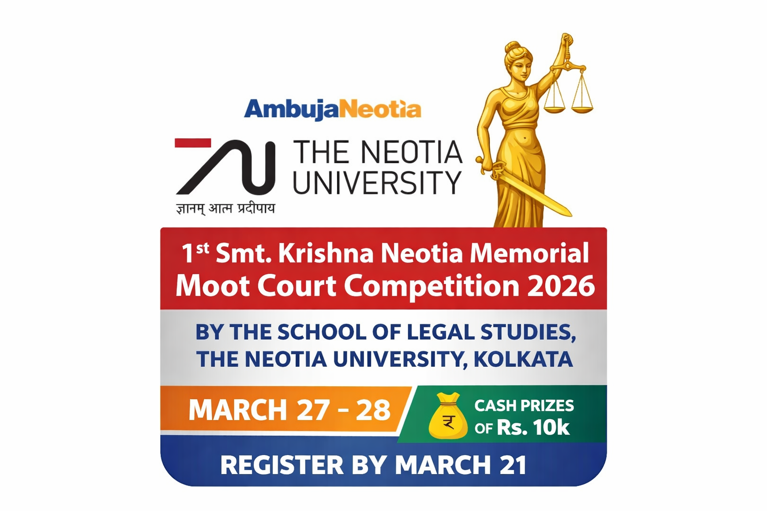 The School of Legal Studies, The Neotia University, is organizing the 1st Smt. Krishna Neotia Memorial Moot Court Competition, 2026. The School of Legal Studies is dedicated to providing high-quality legal education, fostering academic excellence, and developing advocacy skills among students.