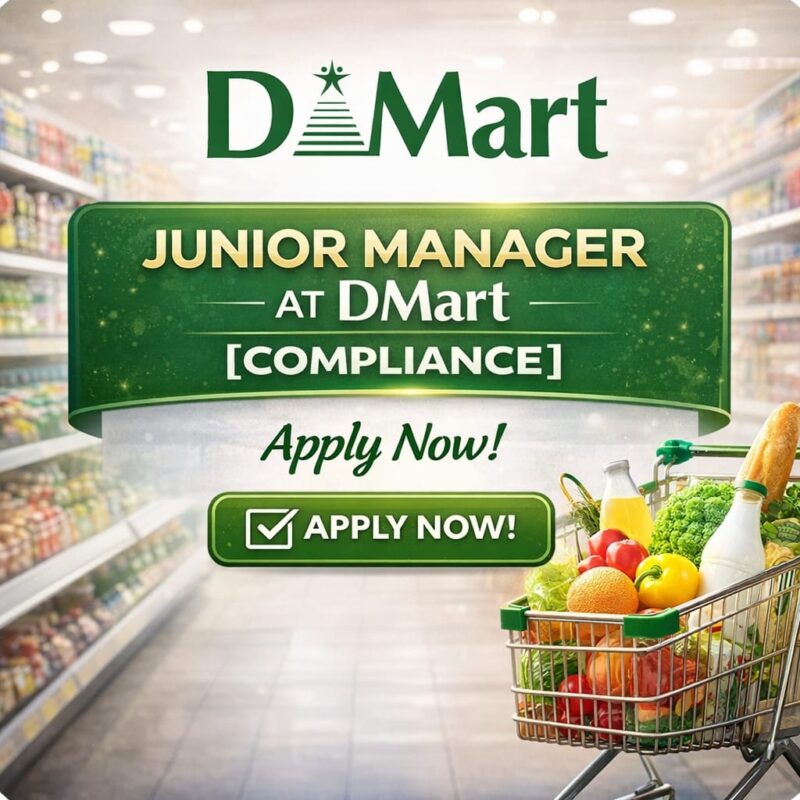 13 Jan Job Opportunity Junior Manager at DMart [Compliance]: Apply Now! January 13, 2026 By Lexful 0 comments About DMart DMart is a popular Indian supermarket chain founded by Radhakishan Damani in 2002, known for its “Everyday Low Cost... Continue reading