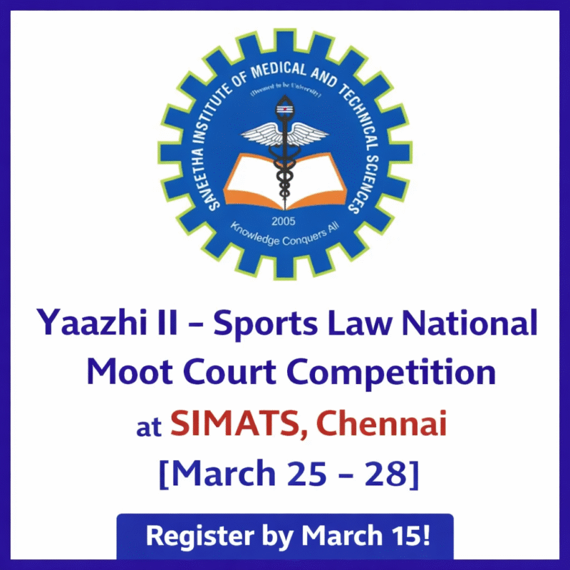 13 Mar Legal Competition Yaazhi II – Sports Law National Moot Court Competition at SIMATS, Chennai March 13, 2026 By Lexful 0 comments About the Organiser Saveetha Institute of Medical and Technical Sciences (SIMATS), established in 1986, is one of India’s premier ac... Continue reading