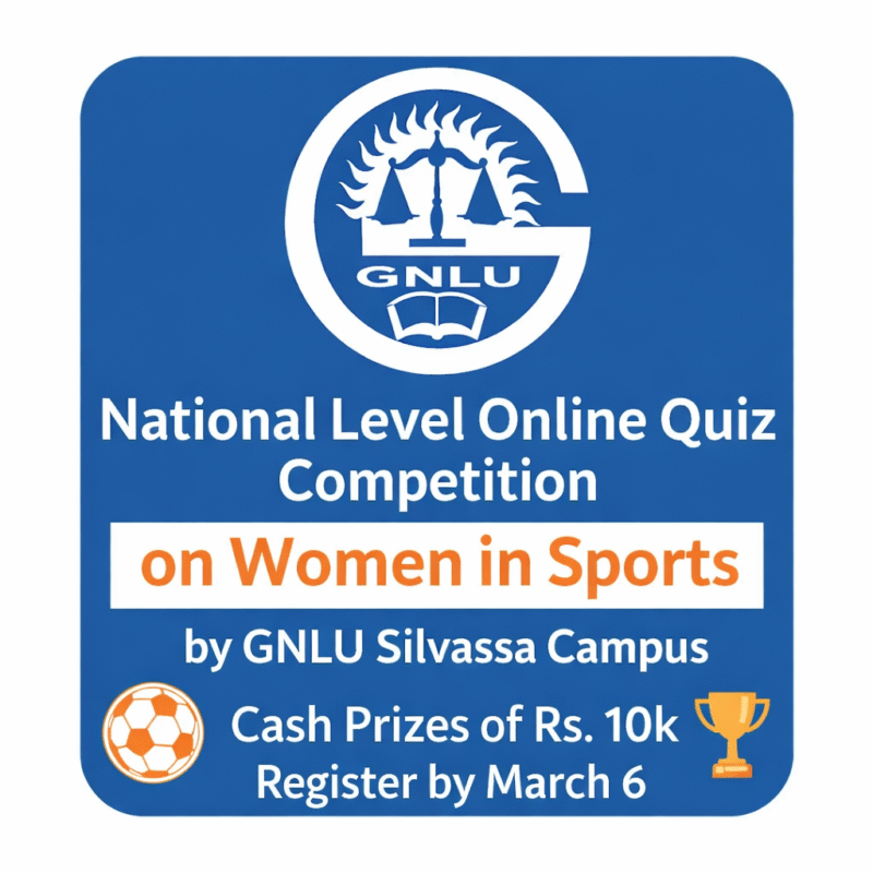 04 Mar Legal Competition National Level Online Quiz Competition on Women in Sports by GNLU, Silvassa Campus March 4, 2026 By Lexful 0 comments About GNLU, Silvassa Campus Gujarat National Law University – Silvassa Campus (GNLU-S) was established pursuant to a resolution of t... Continue reading