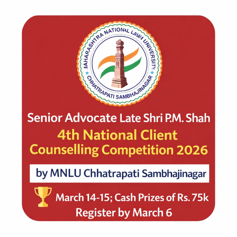 04 Mar Legal Competition Senior Advocate Late Shri P.M. Shah 4th National Client Counselling Competition 2026 by MNLU Chhatrapati Sambhajinagar March 4, 2026 By Lexful 0 comments About the University Maharashtra National Law University, Chhatrapati Sambhajinagar (MNLUCS), established in 2017, is an independent... Continue reading
