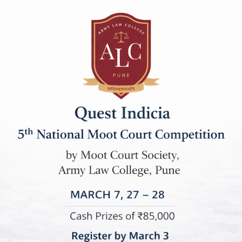 03 Mar Legal Competition Quest Indicia 5th National Moot Court Competition 2026 by Moot Court Society, Army Law College, Pune March 3, 2026 By Lexful 0 comments About the Competition The Army Law College, Pune, is resolved to offer an enriched platform through the ‘Quest Indicia National Moot... Continue reading