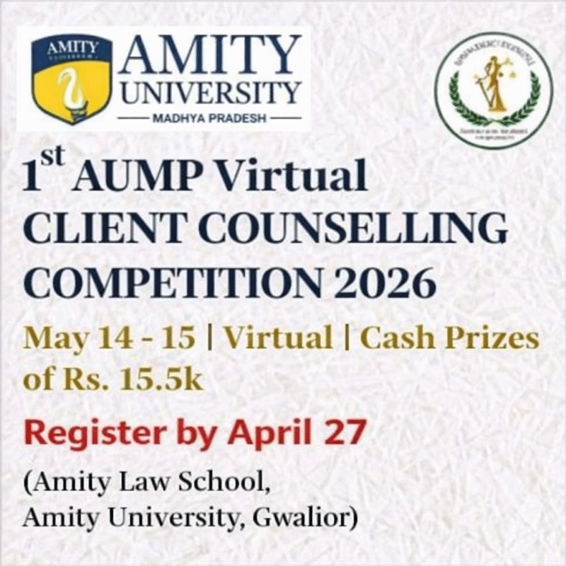 10 Apr Legal Competition 1st AUMP Virtual Client Counselling Competition 2026 by Amity Law School, Amity University, Gwalior April 10, 2026 By Lexful 0 comments About the Competition The Client Counselling Competition is designed to provide participants with an opportunity to experience a sim... Continue reading