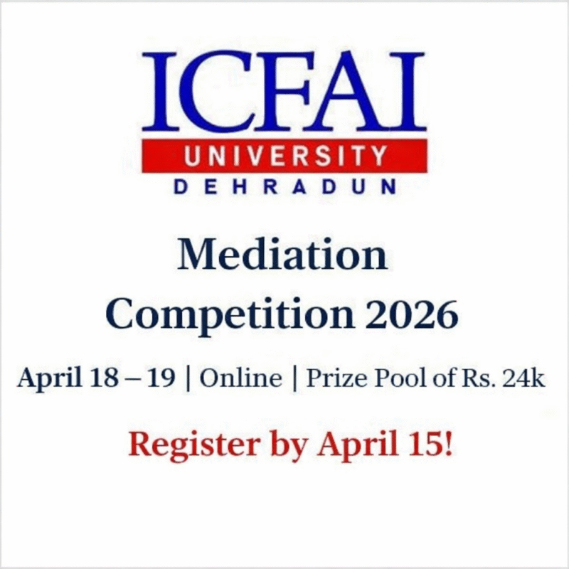 10 Apr Legal Competition Mediation Competition 2026 at ICFAI University, Dehradun April 10, 2026 By Lexful 0 comments About the Organizers The ICFAI University, Dehradun, Uttarakhand (hereinafter referred to as the University) was established under T... Continue reading