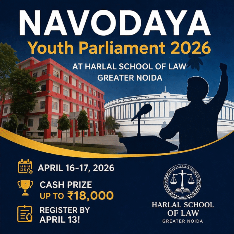 07 Apr Legal Competition NAVODAYA: Youth Parliament 2026 at Harlal School of Law, Greater Noida April 7, 2026 By Lexful 0 comments About Harlal School of Law Harlal School of Law (HSL) was established in the Year 2004 by Shanti Educational Society, registered und... Continue reading