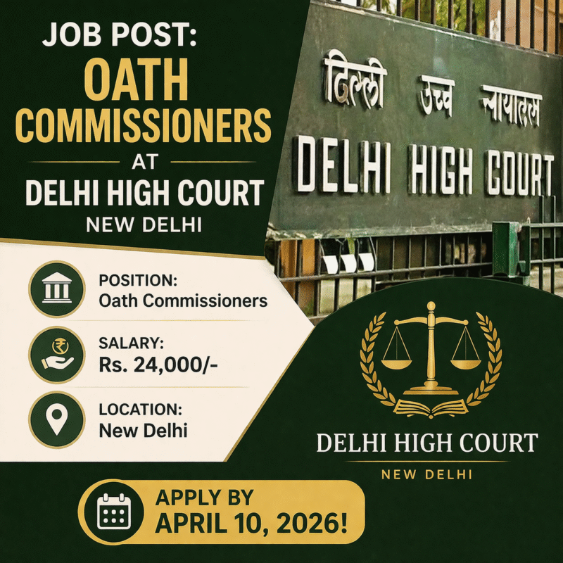 07 Apr Job Opportunity Oath Commissioners at Delhi High Court, New Delhi | Job April 7, 2026 By Lexful 0 comments About the Position Applications are invited for appointment of Oath Commissioners exclusively for Delhi High Court, New Delhi from t... Continue reading