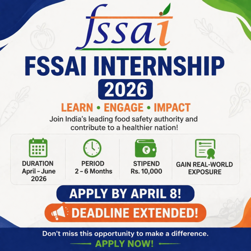 07 Apr Internship Opportunity FSSAI Internship 2026 [April – June; 2 – 6 Months; Stipend of Rs. 10k] April 7, 2026 By Lexful 0 comments About FSSAI Food Safety & Standards Authority of India (FSSAI) is a statutory body established under the Food Safety & Stand... Continue reading