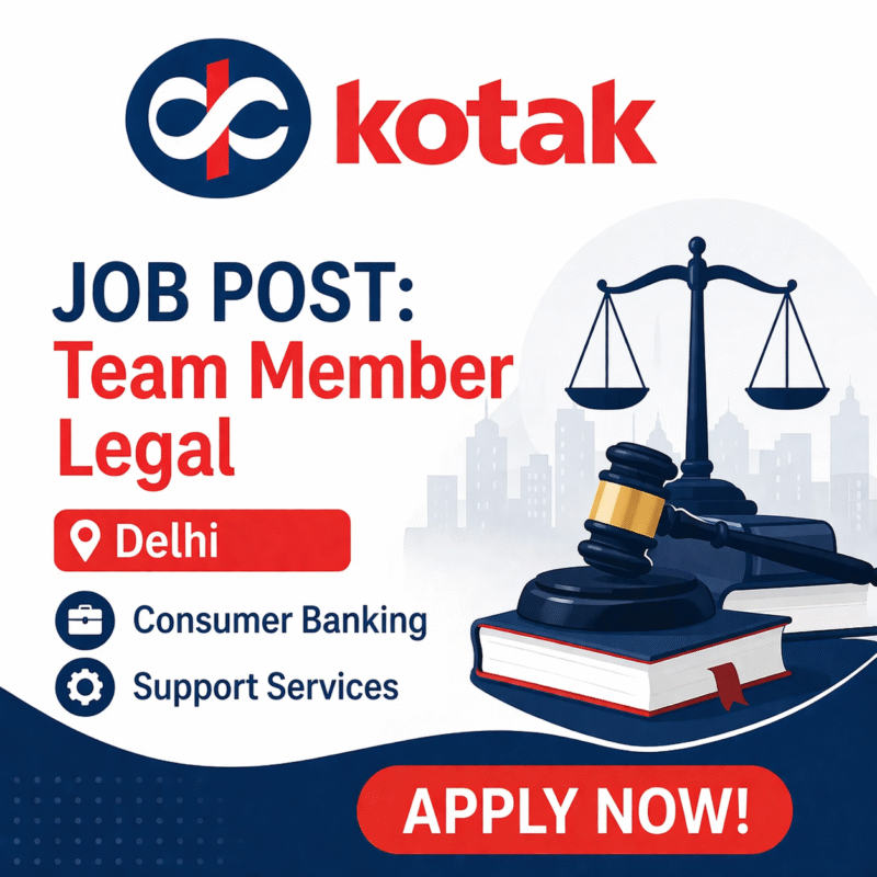 09 Apr Job Opportunity JOB POST: Team Member Legal at Kotak Mahindra Bank, Delhi April 9, 2026 By Lexful 0 comments About Kotak Mahindra Bank Kotak Mahindra Bank is a premier Indian financial services conglomerate established in 1985 (as a NBFC) an... Continue reading