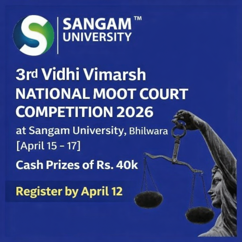 28 Mar Legal Competition 3rd Vidhi Vimarsh National Moot Court Competition 2026 at Sangam University, Bhilwara March 28, 2026 By Lexful 0 comments About the Organisation Sangam University was established in 2012 by the Badrilal Soni Charitable Trust and promoted by the Sangam Gr... Continue reading