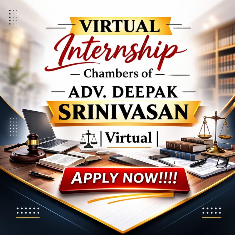 27 Feb Internship Opportunity Virtual Internship – Chambers of Adv. Deepak Srinivasan | Virtual | Apply Now!!!! February 27, 2026 By Lexful 0 comments About the Advocate Advocate Deepak Srinivasan is a legal practitioner before the Madras High Court, engaged in litigation and legal ... Continue reading