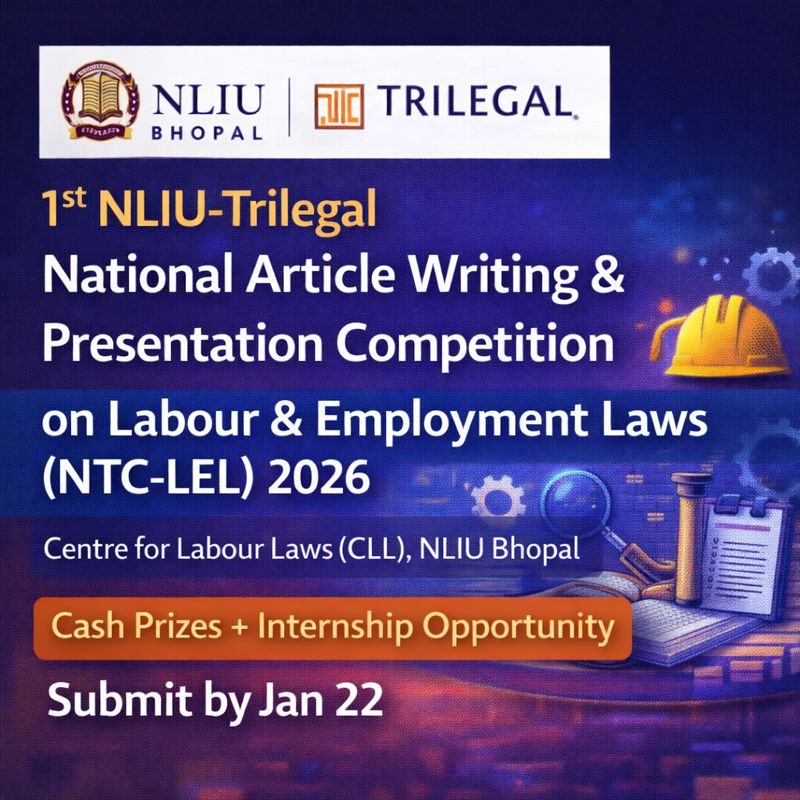 10 Jan Legal Competition NLIU-Trilegal Labour Law Article Competition 2026 January 10, 2026 By Lexful 1 comment Participate in the 1st NLIU-Trilegal National Article Writing & Presentation Competition on Labour and Employment Laws (NTC-LEL) 20... Continue reading