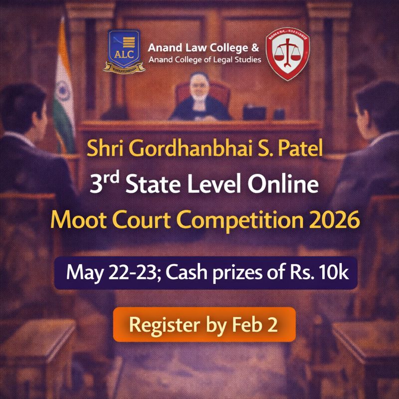 06 Jan Legal Competition Shri Gordhanbhai S. Patel Moot Court Competition 2026 January 6, 2026 By Lexful 0 comments Register for the Shri Gordhanbhai S. Patel 3rd State Level Online Moot Court Competition 2026, organised by Anand Law College and Anand... Continue reading