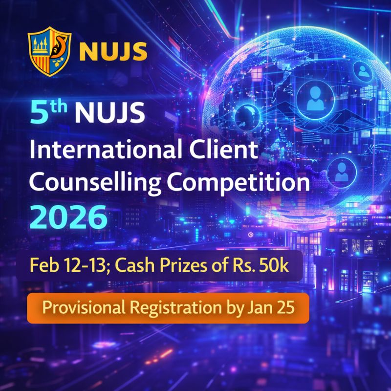 08 Jan Legal Competition 5th NUJS International Client Counselling Competition 2026 January 8, 2026 By Lexful 0 comments Register for the 5th NUJS International Client Counselling Competition 2026 at NUJS Kolkata. Event dates: Feb 12–13. Win cash prizes wo... Continue reading